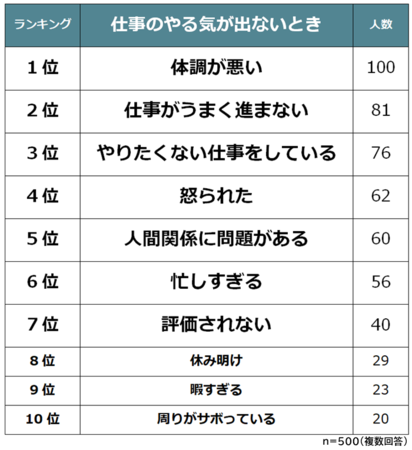 「どんなときに仕事のやる気が出なくなりますか?」と聞いたところ、回答は以下のようになりました。上位10位までをランキング形式で紹介します。