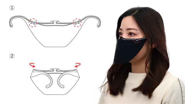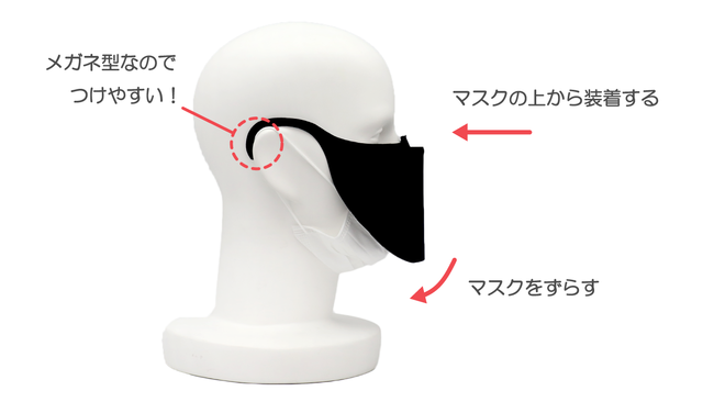 普段着けているマスクを顎にずらし、その上から装着できるメガネ型です。外したマスクの保管場所に迷わないのでスマートに喫煙できます。