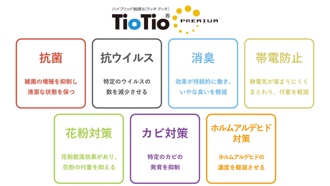 ハイブリッド触媒(R)TioTio(R)PREMIUM加工は、「大阪大学産業科学研究所と株式会社サンワード商会」による共同開発によって生まれた多機能型触媒を使用した安全性の高い加工です。本製品にも付与することで抗菌・抗ウイルスなど様々な効果を得られます。