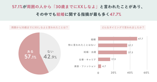 57.1%が周囲の人から「30歳までにXXしなよ」と言われたことがあり、その中でも結婚に関する指摘が最も多く47.7%
