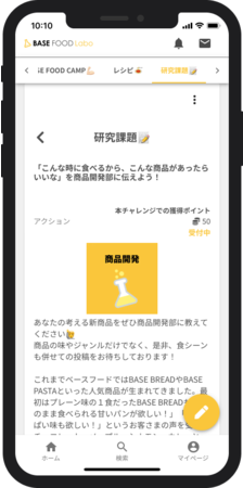ベースフードから研究員に向けて、商品・サービスに関するテーマを「研究課題」として提示。研究員はテーマに合わせてコメント投稿のみで気軽に参加可能です。この「研究課題」からは、これまでにも商品改善や新商品のアイデアになるヒントがうまれており、オリジナルアプリではコンテンツを5個に拡大し、今後、各コンテンツに基づいた研究課題を随時追加していく予定です。