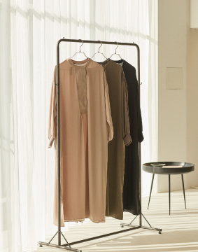 授乳中諦めてしまいがちなワンピースはセットのインナーキャミソールをカシュクール仕様にし、そのまま授乳できるデザインにしています。落ち感のある素材とスマートなフロントデザイン、ふんわりとした袖等、程よくモード感をプラスしてくれるワンピースです。