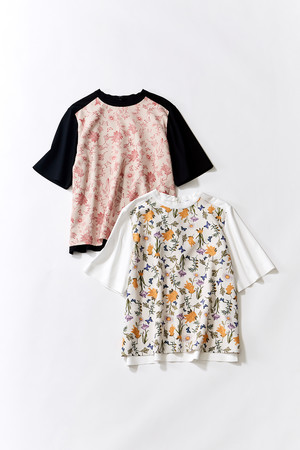 福田愛子さんのオリジナル柄を前身頃にプリントしたTシャツは、一枚で存在感を放ち、着映えるデザイン。S.ESSENTIALSで人気のドレスTシャツ生地を使用し、ジャージ素材でありながらブラウスのようなハリ感を実現。ゆったりとしたセットインスリーブで、二の腕もしっかりとカバー。ワンピースと同じく、花柄部分にはリサイクルポリエステルを含んだサステナブルな素材を使用。