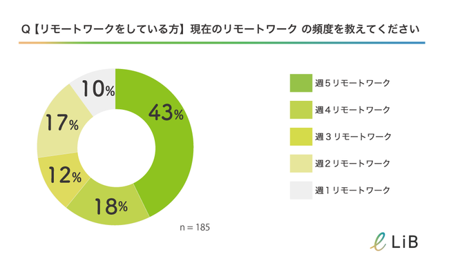 「リモートワークをしている」と回答した方のうち、43%の人が「週5リモートワーク (フルリモート)」で働いている方が43%。「週4リモート勤務(週1出社)」で働いている方が18%という結果でした。