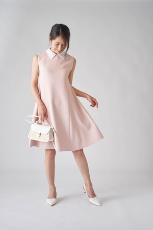 衿もとににタックフリルを施し、取り外しのボウタイリボンでお顔回りを華やかに演出します。スカートにはランダムな幅のプリーツを施し、動くたびに軽やかな動きが楽しめるワンピースです。
