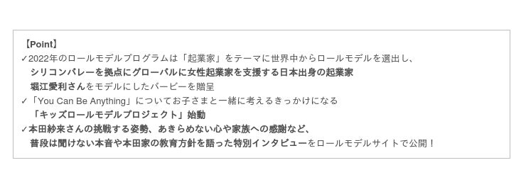 また、今年より、ロールモデルプログラムの根幹である「You Can Be Anything=何にだってなれる」のメッセージを、お子さまと保護者が身近に感じ、一緒に考えていくきっかけにしてほしいという想いから、日本初の「キッズロールモデルプロジェクト」を開始いたします。第1弾として本田紗来さんのオリジナルインタビューを2022年3月8日(火)に特設サイトに掲載いたします。