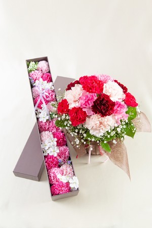 ホワイトのピッチャーに、花言葉が「母への愛」の真っ赤なカーネーションをあしらったアレンジメントは、テーブルなどに置くだけでオシャレな空間を演出します。