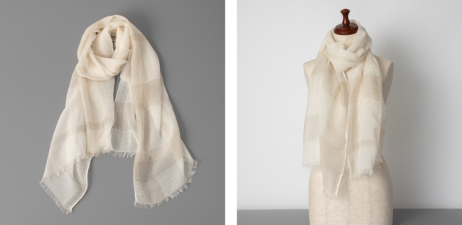 トルコ産のオーガニックコットンとリネンを組み合わせた上品なチェックストールです。尾州の機屋で細く繊細な糸を使用し、ゆっくりと時間を掛けて丁寧に織りあげています。薄くさらっとした質感で、真夏の冷房対策にもおすすめ。UV加工も施しているので、暑い時期のUV対策にもご使用いただけます。