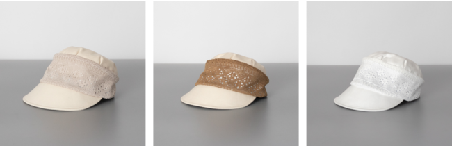 「レース」をテーマにトルコ産のオーガニックコットンとレースを組み合わせた商品です。おでこに当たる汗止めテープにはファンデーションの汚れが落ちやすい抗菌・防臭素材を使用、つば部分には遮光素材を使用し、気になる日差しをケアできます。