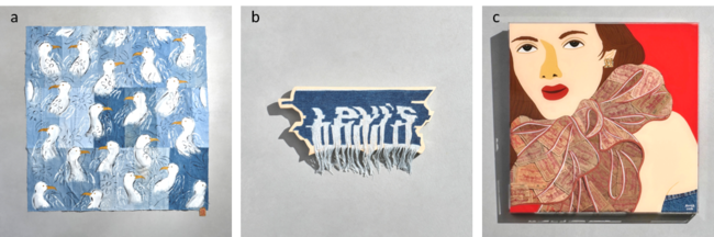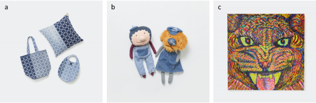 a)<minä perhonen>クッション36,300 円トートバッグ36,300円エッグバッグ24,200円、b)<Bobby Dazzler>ぬいぐるみ 各18,700円、 c)<キシモトマイ>約140x140cm1,100,000円