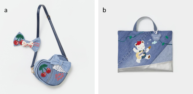 a)<シャーリーテンプル>チェリーデニムハートショルダーバッグ 19,580円、チェリーデニムリボンクリップ 9,680円、b) <ファミリア>デニムバッグ 49,500円(オンラインストアのみ)