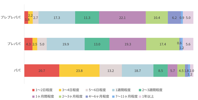 ● “未来のパパ”の5割近くが思い描く育休期間は「1ヶ月以上」、しかし実際のパパの育休期間は「1週間以下」が8割弱