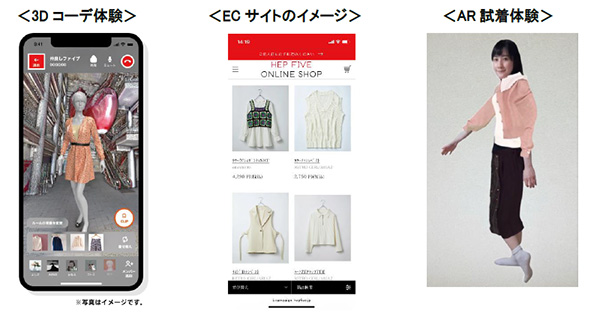 本実証実験では、上記期間中HEP FIVEにて「TRY ON!NEW STYLE PROJECT」と題したイベントを開催し、ドコモが開発を進めるXRコンテンツ開発ツールや衣装3Dモデル加工技術を活用した実証実験用アプリ「HEPSコーデ」(以下、本アプリ)を提供するほか、ECサイト「HEP FIVE ONLINE SHOP」(以下、本EC)を開設するとともに、HEP FIVE内に「AR試着体験ゾーン」を設置します。本アプリでは、バーチャル上に再現したHEP FIVEで3D化したファッションアイテムのコーデ体験ができ、友人と一緒に会話をしながら複数ブランドのアイテムを組み合わせて、コーディネートを楽しめます。また、本ECを利用することで、本アプリで紹介するアイテムのほか、HEP FIVEに入居するさまざまな人気ショップのアイテムを、24時間いつでもどこからでもご購入いただけます。さらに、「AR試着体験ゾーン」では、ドコモが開発した3Dバーチャル試着システム「3D Dress-up システム(R)(スリーディードレスアップシステム)」を活用したデジタルサイネージを設置することでAR試着を楽しむことができます。また、本アプリと同様に3D化したファッションアイテムを利用したコーデも体験できます。