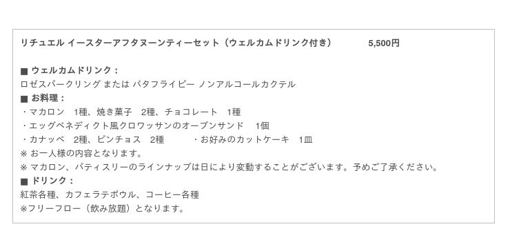 リチュエル イースターアフタヌーンティーセット コース詳細 ※ 10%税込表示