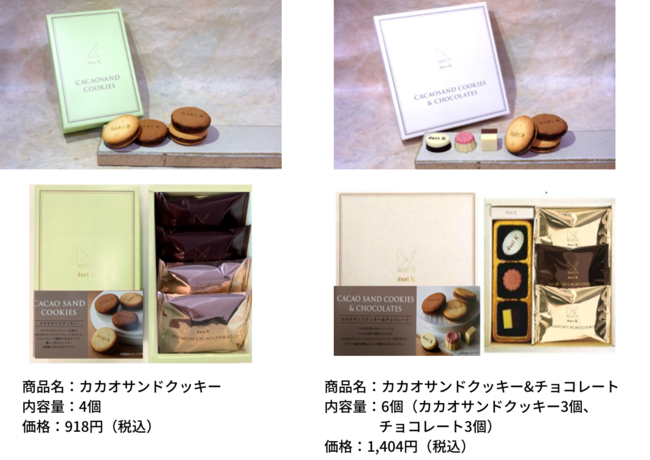 第1弾のカカオショコラバーに続いて販売する第2弾では、2種類の商品をご用意しました。Dari Kでギフトとして人気ナンバーワンのラングドシャを4枚入れた「カカオサンドクッキー」と、シンプルに素材を味わう2層チョコレートとカカオサンドクッキーを詰め合わせた「カカオサンドクッキー&チョコレート」です。