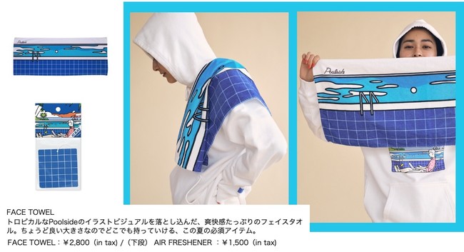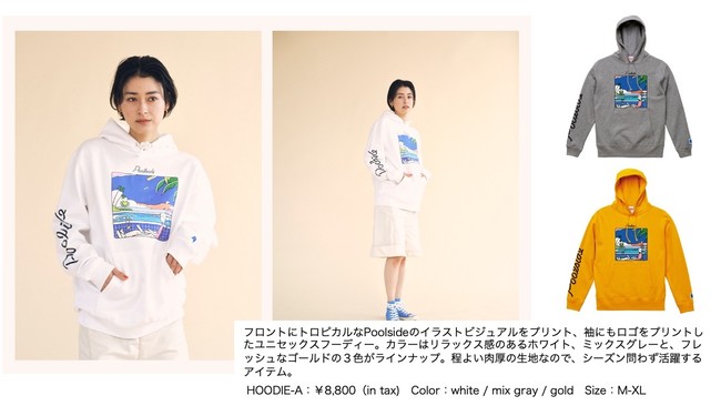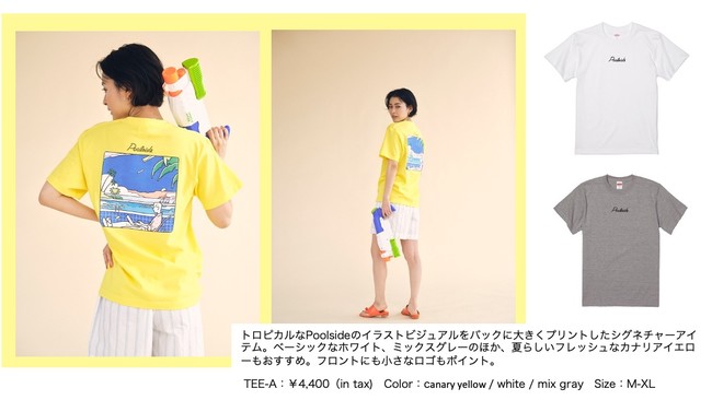 夏休みが忘れられない大人たちのサービス<Poolside>のマーチャンダイジングは、雑誌、広告、書籍、TVCMなど幅広い分野で活動を行う、イラストレーターの金安亮氏がデザインした、サービスのメインビジュアルを落とし込んだユニセックスアイテムがラインナップ。