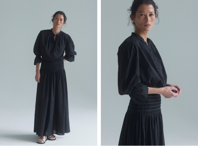 「「軽やかな黒」は、少しドライで少し透ける素材だからこそ表現できる。甘さのあるシルエットを、たっぷりとした分量で楽しんで。今はまだ自由に行かれない、「旅先の景色」にも似合う――そんな黒。」