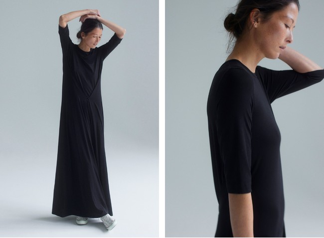 「着方で3つのシルエットが作れるワンピースは、肌に溶けるようななめらかな素材で、「装うこと」をうんと楽にしてくれます。例えば仕事の出張で、昼はボタンをフロントで留めてジャケットを羽織り、夜はバックポイントを華やかに。さらに、1日あった休日はストレートに着こなせば、全く違うドレスのように見えます。」