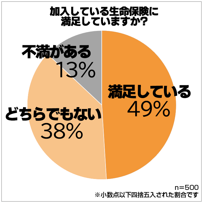 同アンケートによると、今加入している保険の満足度は「満足している」が49%、「どちらでもない」「不満がある」を合わせると51%ですので、半々といったところです。