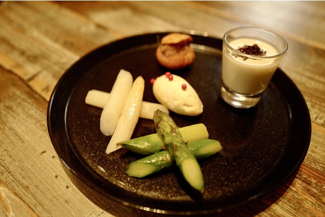 ・2色アスパラガスの揚げ浸し サフランのムースリーヌ