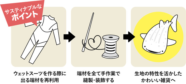 ウエットスーツに使う生地はゴム製で、産業廃棄物として処分されます。裁断時に出てしまう端材を廃棄せず、何かに活用したいという想いのもと誕生したのが、海の生き物をモチーフにしたアップサイクル雑貨です。