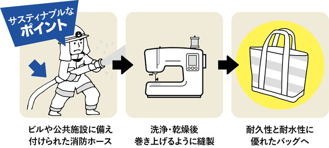 ビルや公共施設などに備え付けられた消防ホースの9割は新品のまま廃棄されてしまいます。回収したホースは洗浄、乾燥ののち、職人の手で丁寧に裁断、縫製されます。長いホースをらせん状に縫製することで、サイドに縦の縫い目が出ないのが特徴。もとの素材が持つ性能である耐久性と耐水性だけでなく、本来の形もデザインに活かされた作りになっています。