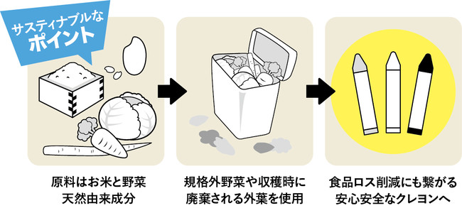 規格外などの理由ではじかれてしまう野菜や、収穫時に廃棄されてしまう外葉を原料にして着色。ベースとなるのは玄米を精米する際に発生する米ぬかから採れた米油とライスワックスです。発色を安定させるために配合される顔料も、食品の着色に使われるのと同じ成分。万が一口に入れても安全な天然由来成分でできています。食品ロス削減にもつながる、人にも環境にもやさしいクレヨンです。