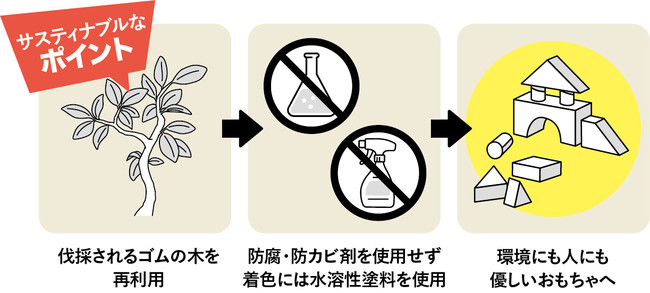 プラントイのおもちゃは、ゴムの木からできています。ゴムの木は、5~6年で成木になり、樹液が採れなくなったら伐採されます。この古くなった木を再利用し、作られているのです。安全面を優先し、防腐剤や防カビ剤を使用せず、着色も鉛やその他重金属を含まない水溶性塗料をセレクト。また、パッケージには再生紙と分解されやすいソイインクを使用するなど、効率よくリサイクルができるような工夫が凝らされています。