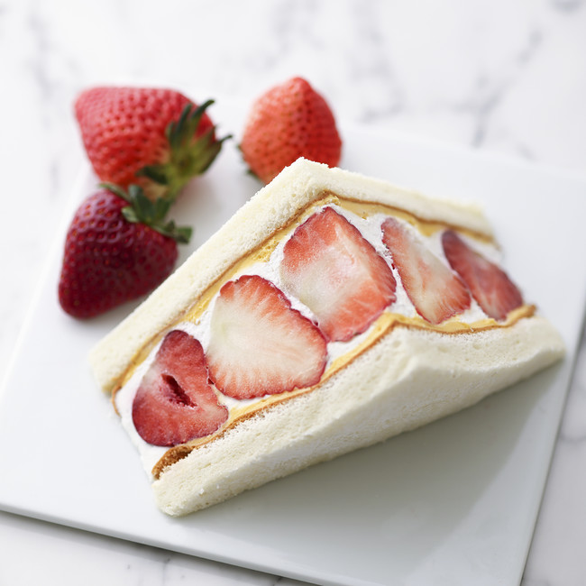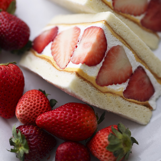 ふんわりと甘さ控えめの生地でサンドするのは、選び抜いた卵と牛乳を使った特製のカスタードクリーム、口どけがよく軽い味わいのシャンティー、そして、栃木県のいちご農園から届くフレッシュな旬の苺です。