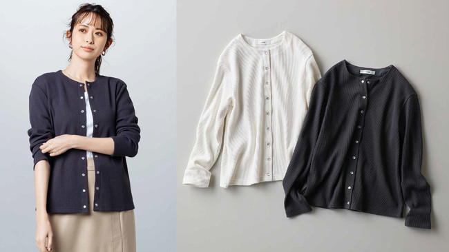 ふっくらとしたワッフル素材にほどよく詰まったクルーネックのカーディガンです。パール調のスナップボタンできちんと感が漂う上品なたたずまいになっています。カットソーながら適度な張りときれいな表面感を持つ素材だからカジュアル過ぎず、着映え感を演出します。