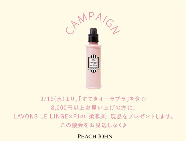 期間中、ピーチ・ジョン公式通販サイトまたは店舗にて、「すてきオーラブラ」を含む税込8,000円以上ご購入のお客様