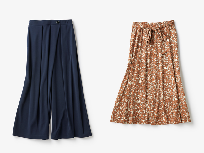 「スムースジャージー・フレアガウチョ」は生地をたっぷりと使用しボリューミーでエレガントなスカートライクパンツです。「スムースジャージー・ラップ風フレアスカート」はリボンベルトでウエスト細見え効果抜群の女性らしいシルエットに仕上げています。