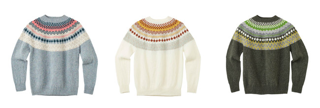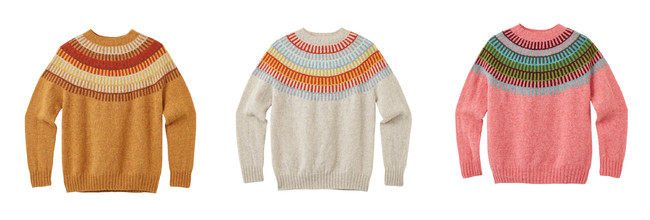 こちらも、イギリスで400年以上編み続けられている伝統的な古典柄「フェアアイル」や北欧のニットウェアにインスパイアされて作られている定番人気セーターの新デザイン。ビビッドなカラー展開が印象的。