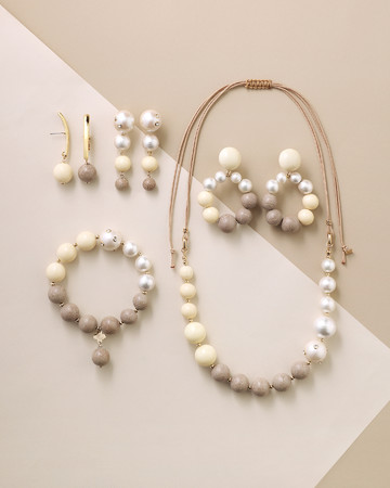 環境に配慮した素材に、自社で保管していたデッドストックのコットンパールを組み合わせ、素材の優しい色味を活かした温かみのあるデザインに仕上げました。