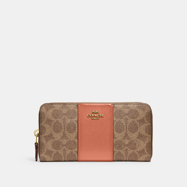 2022年注目のラッキーカラーと言われるコーラルピンク。コーチのアイコニックなシグネチャーパターンとのコンビネーションで、落ち着いたトーンのヴィンテージ感あるデザインに仕上がっています。収納力が人気のジップアラウンドの長財布、三つ折りで見た目以上の収納力のミニエンベロープ型も使いやすく人気です。また、付属ストラップを付けるとクロスボディになる財布バッグは、ストラップを外してクラッチとして、財布としてバッグにそのまま収納も可能。旅行やちょっとした外出に便利な3Wayで活躍します。外側にはオープンポケットが付きカードやスマホの出し入れがしやすく機能面も充実しています。