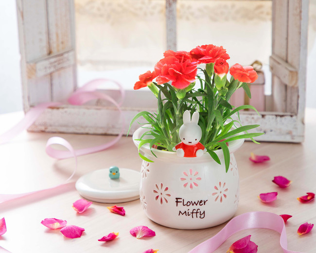 ミッフィーがおすわりしたシンプルな陶器ポットに、カーネーションをセットしてお届けいたします。