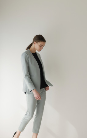 シンプルで削ぎ落としたシルエットに、深いVネックラインがシャープな印象のジャケット。表に見えないメタルスナップが前開きで着た時のアクセントに。