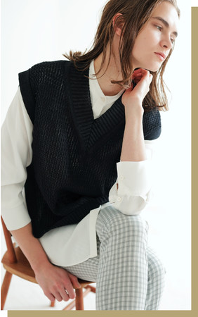 綿と美濃和紙を原料に、特殊な撚糸方法で作った日本製の糸。そんなこだわりの糸を使い、ホールガーメントで編み上げたシームレスニットです。素材の特徴は吸湿性、保温性、消臭、抗菌性に優れていること。春夏シーズンらしい軽量でさらりとした肌触りがポイントです。前後で柄を変えた編み地や、両脇のスリット、ドロップショルダーなど、デザインにも細かなディテールへのこだわりが詰まっています。シャツやシアー素材のハイネックニットなどとのコーディネートがおすすめです。