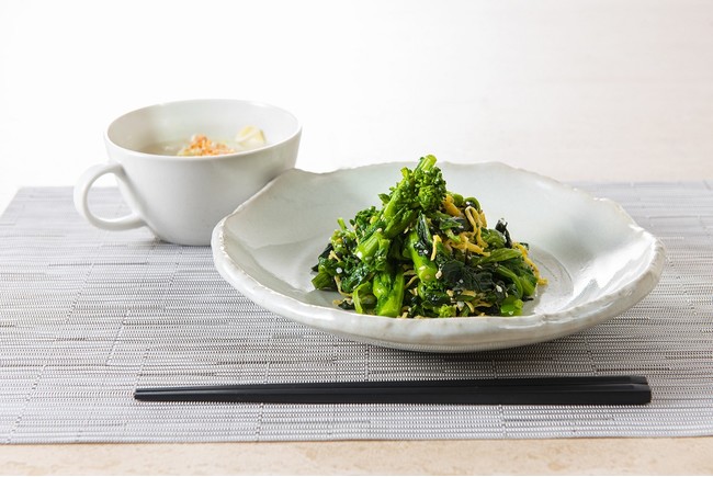 菜の花を使用した春らしい和え物です。美肌や免疫力UPにも期待ができる生塩糀を使用した健康的な一品です。