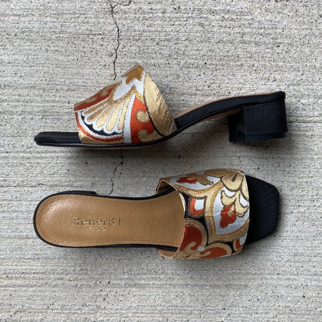 “西陣織” とは京都で生産・染色された正絹だけを使用し、作品作り想像力と表現力の呼称です。 西陣織業を営み続け60年間もの間ストックされ続けていた、作品作りの際に生まれた貴重な資料でもある目出し (※1) をサンダルへとアップサイクルします。 日本の伝統や文化、職人の技術を永く大切に残していきたいと両社が共鳴し、今回のコラボレー ションを生み出しました。田村屋の美しい西陣織がMade in Japanに拘ったアップサイクルブランドであるRelier81の手によって新たな命が吹き込まれます。