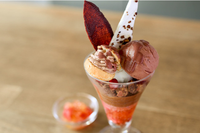 カカオの香り広がる5種のチョコレートと、チョコレートを楽しむための12のパーツからおつくりした、カカオ産地を巡るようにチョコレートを味わい尽くすパフェです。カカオ由来の果実やナッツのようなフレーバーなど、多彩な個性をもつチョコレートをさまざまなパーツで使っています。チョコレートの変化する味わいと豊かな香りを、軽やかに最後までお楽しみいただけます。