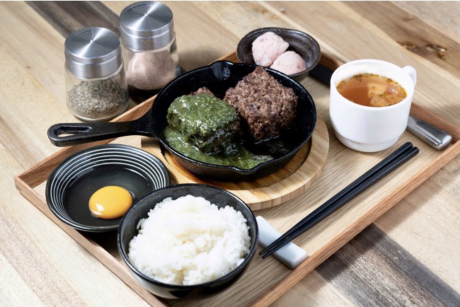 肉を覆う緑色が特徴的な「緑の四角いハンバーグ御膳」を提供開始