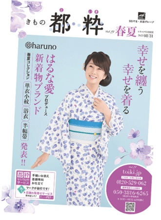 表紙を飾るのは“はるな愛”さん。「きもの都粋」に新たに誕生した(ハート)「haruno」は、はるな愛さんプロデュースの新作ブランド。大人カワイイをテーマに、単衣小紋・浴衣、そしてリバーシブル半幅帯がラインナップ!