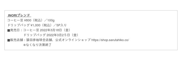 今回のINORIブレンドの利益は、在日ウクライナ大使館を通じて、ウクライナの避難者の生活支援や人道支援として全額寄付させていただきます。猿田彦珈琲は「たった一杯で、幸せになるコーヒー屋」というモットーのもと、支援活動に賛同し、ご購入いただける皆様と一緒にコーヒーを通じて、ウクライナの方々を支援したいと考えています。ささやかですが、温かく穏やかな日常を取り戻すために尽力して参ります。