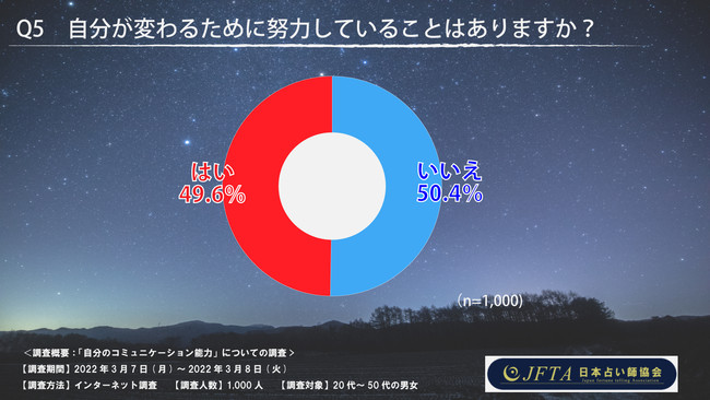 コミュニケーション能力をアップさせるために、何らかの努力をしているという人は約半数でした。