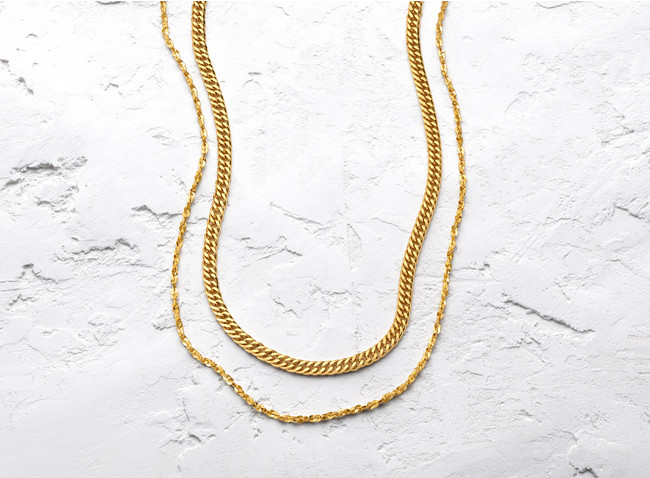 ギンザタナカの純金ネックレスは、どれも純金の素材感や輝きを生かした特徴あるネックレスで、さまざま な線型からスタイリングにあわせて選ぶことができます。人気のキヘイネックレスに、しなやかに輝く細身 の 6 面カットダブル 50cm ネックレスが新たに加わりました。チェーンの一つの輪に対し二つの輪を組み 合わせて上下左右合わせて 6 面のカットが施された美しい仕上がりです。(上画像右から 3 番目) その他、シンプルな 2 面カットの純金キヘイネックレスに加え、きらきら輝く円盤状のパーツをひねってつな げた可憐なシルエットのデザインや、オーバルのパーツを縦横で組み合わせたスタイリッシュなイメージの デザイン、丸型パーツを交互につないだシンプルな線型のデザインなど、どれも純金・純プラチナの素材 の特徴を最大限に生かし、個性的な輝きを放ちます。