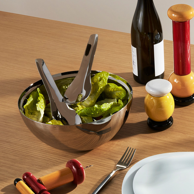 鏡面仕上げのステンレススチールで作られた2重構造のサラダボウルサーバーセット。ダイニングテーブルできらめく存在感が映えます。