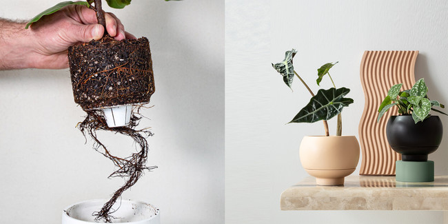 釉薬を塗った上質な陶器で作られたセルフウォータリング プランター。丸みのある形は、特につる植物や垂れ下がる植物にぴったりです。