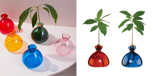 球体のガラスベースで生長するアボカドの美しさと葉や根の形を観察することができるAvocadoベース。MoMA限定カラーは、MoMAコレクションのEllsworth Kelly(エルズワース・ケリー)の作品「Colored Paper Image XXII (Blue Green Yellow Orange Red」(1976~1977)にインスパイアされたものです。