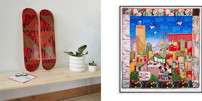 この2枚セットのスケートボードは、ハーレム出身のアーティスト、Faith Ringgold(フェイス・リングゴールド)の協力を得て、MoMAコレクションを代表する彼女の作品「Woman FreedomNow」(1971)のリプロダク
